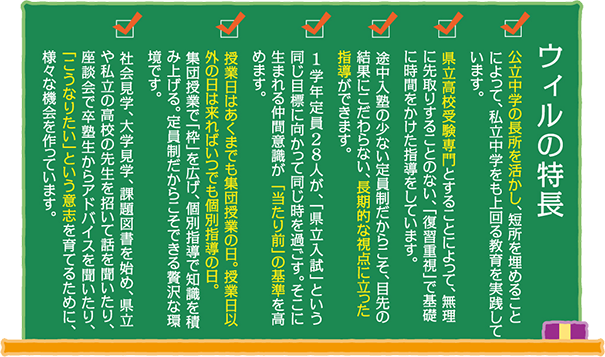 「私立受験はどうするの?」 県立受験だけを見据えたカリキュラムで私立にも対応するには・・・ そのために考え出されたウィルだけの秘策! |